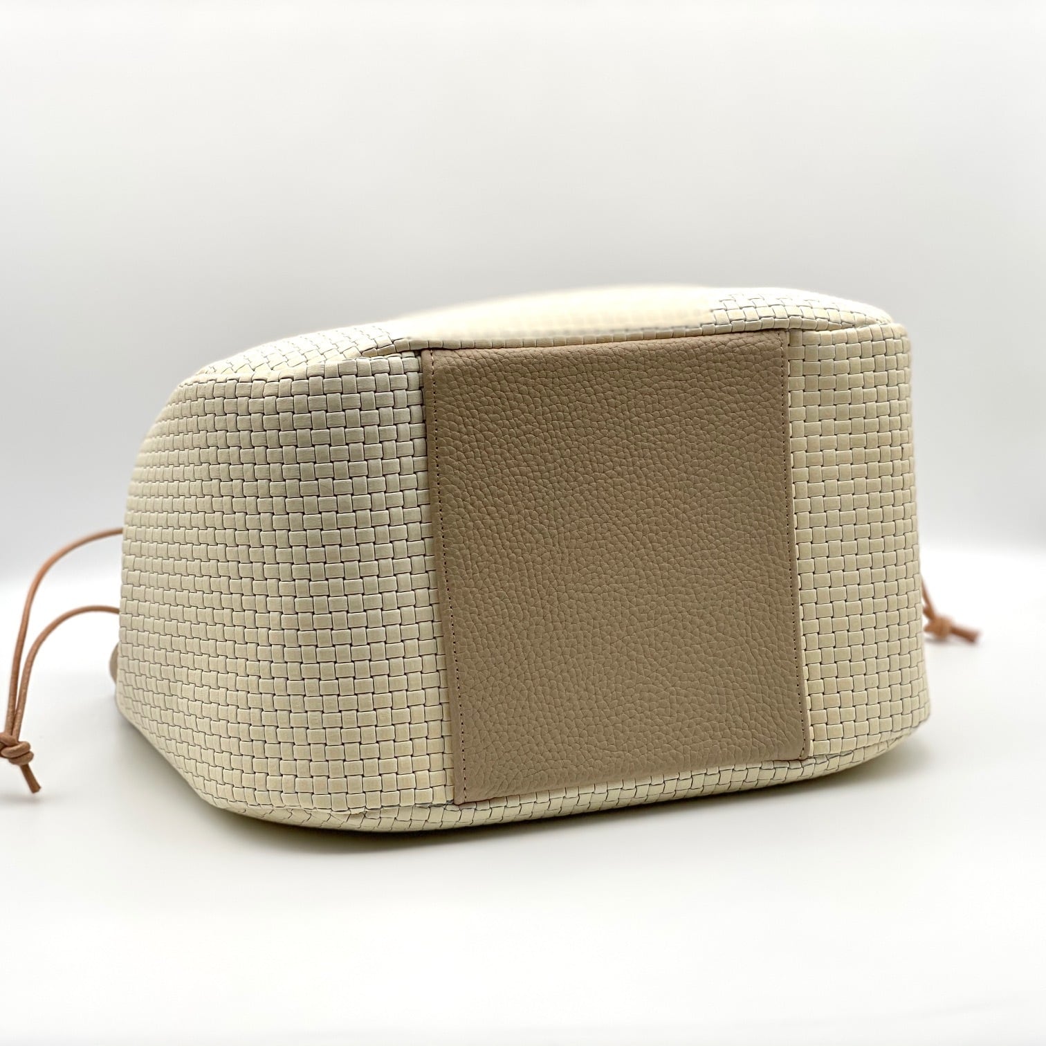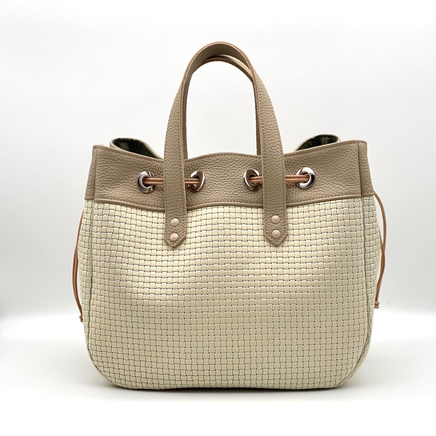網目模様が美しいオフホワイトの牛革と優しいブラウンの牛革を組み合わせたトートバッグです。