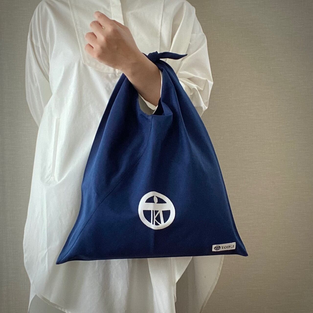 TOIKIのロゴを印象的にあしらった職人手染めの生地でお作りしています。