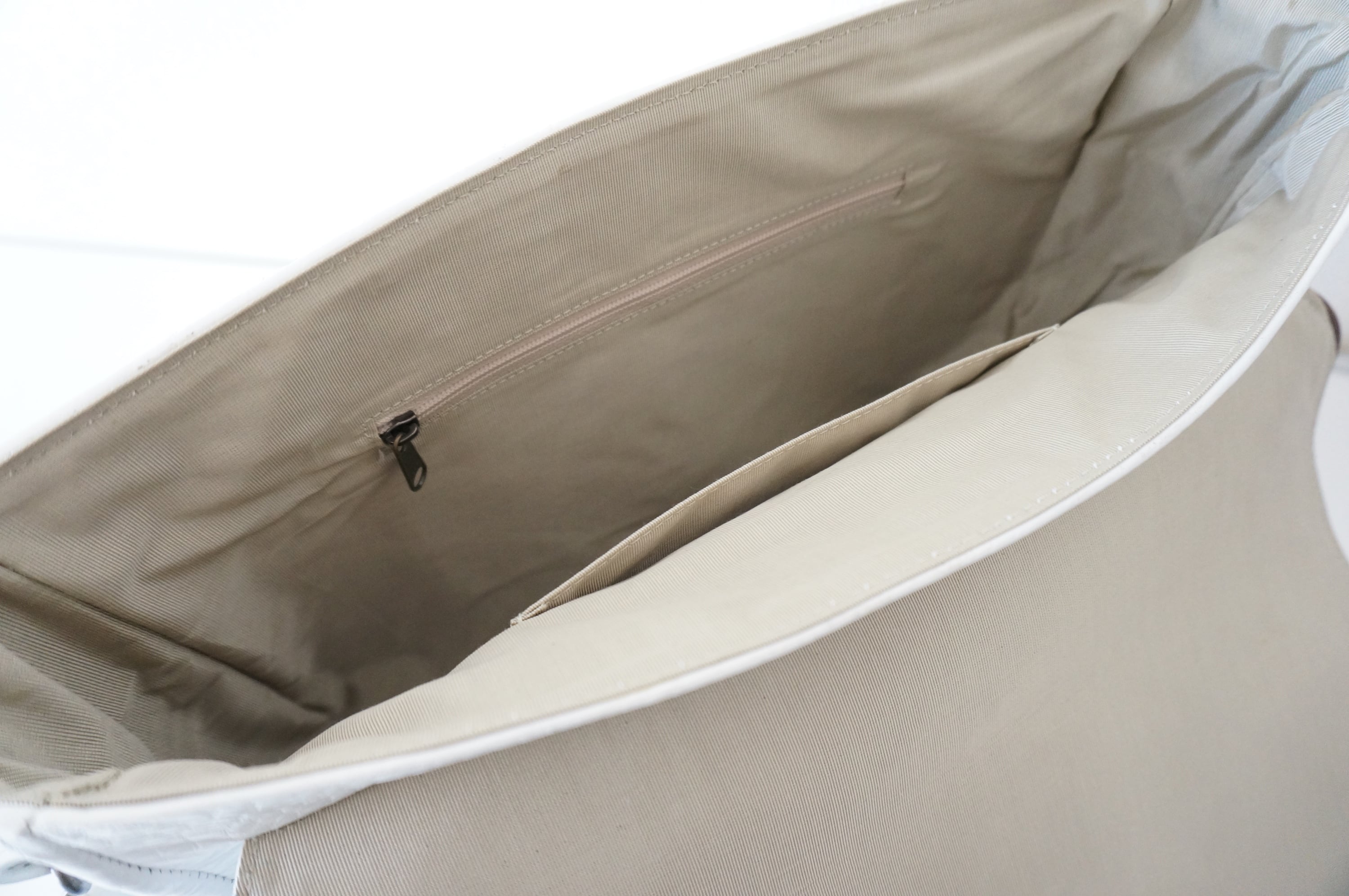 どこかクラシカルな雰囲気のかぶせタイプのBagが、本庄絣を効果的に配置することでレトロモダンな印象になりました。
